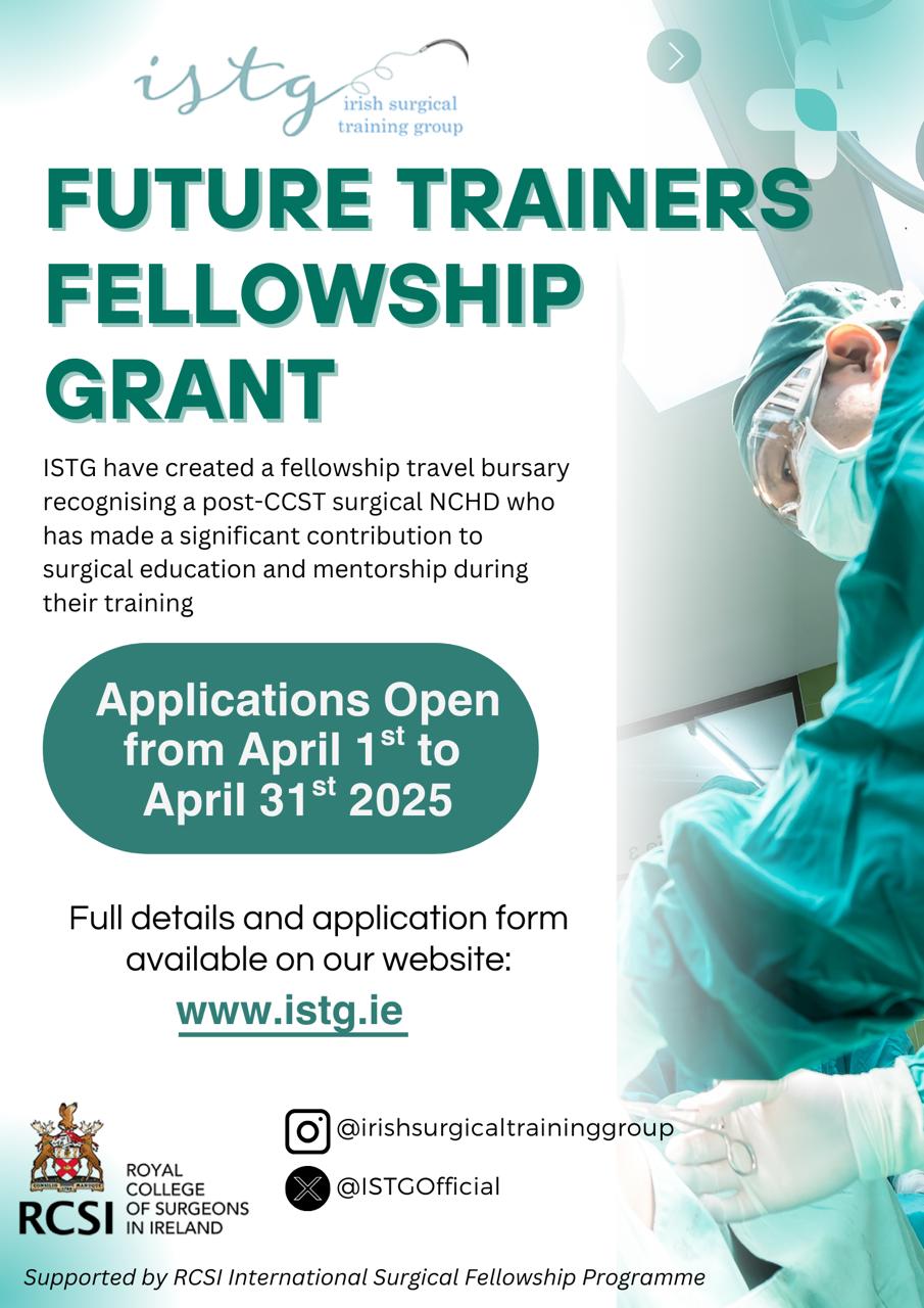 The Irish Surgical Training Group (ISTG) are delighted to announce that applications are open for the 2025 ISTG Future Trainers’ Fellowship Grant.