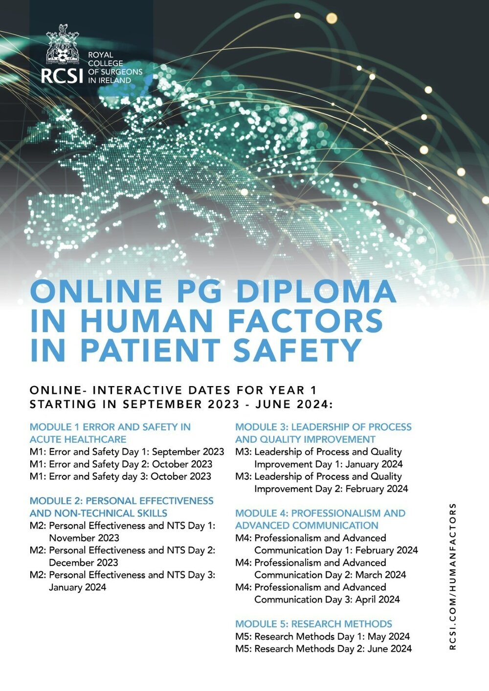 RCSI are pleased to announce the launch of our brand-new 2023-24 provisional timetable for our fully flexible and inter-professional online PG Diploma/MSc. In Human Factors in Patient Safety programme.