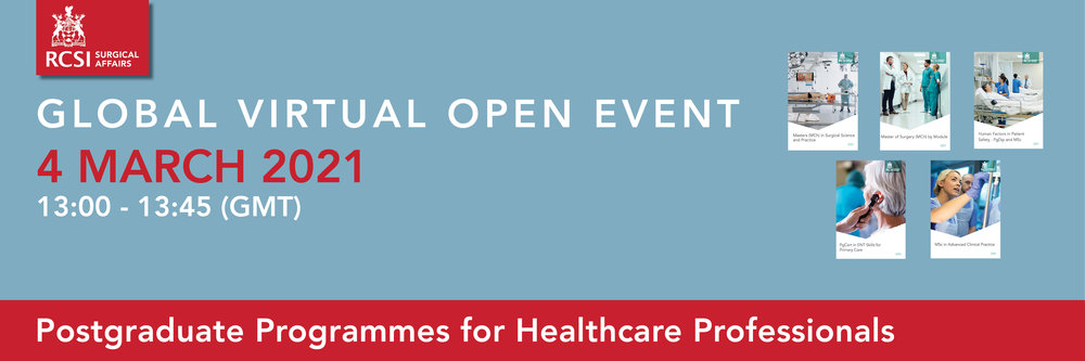RCSI Surgical Affairs will be hosting a global virtual open event on Thursday 4th March 2021, 13:00 - 13:45 (GMT), to discuss a range of postgraduate programmes to support the professional development of those working in healthcare.
