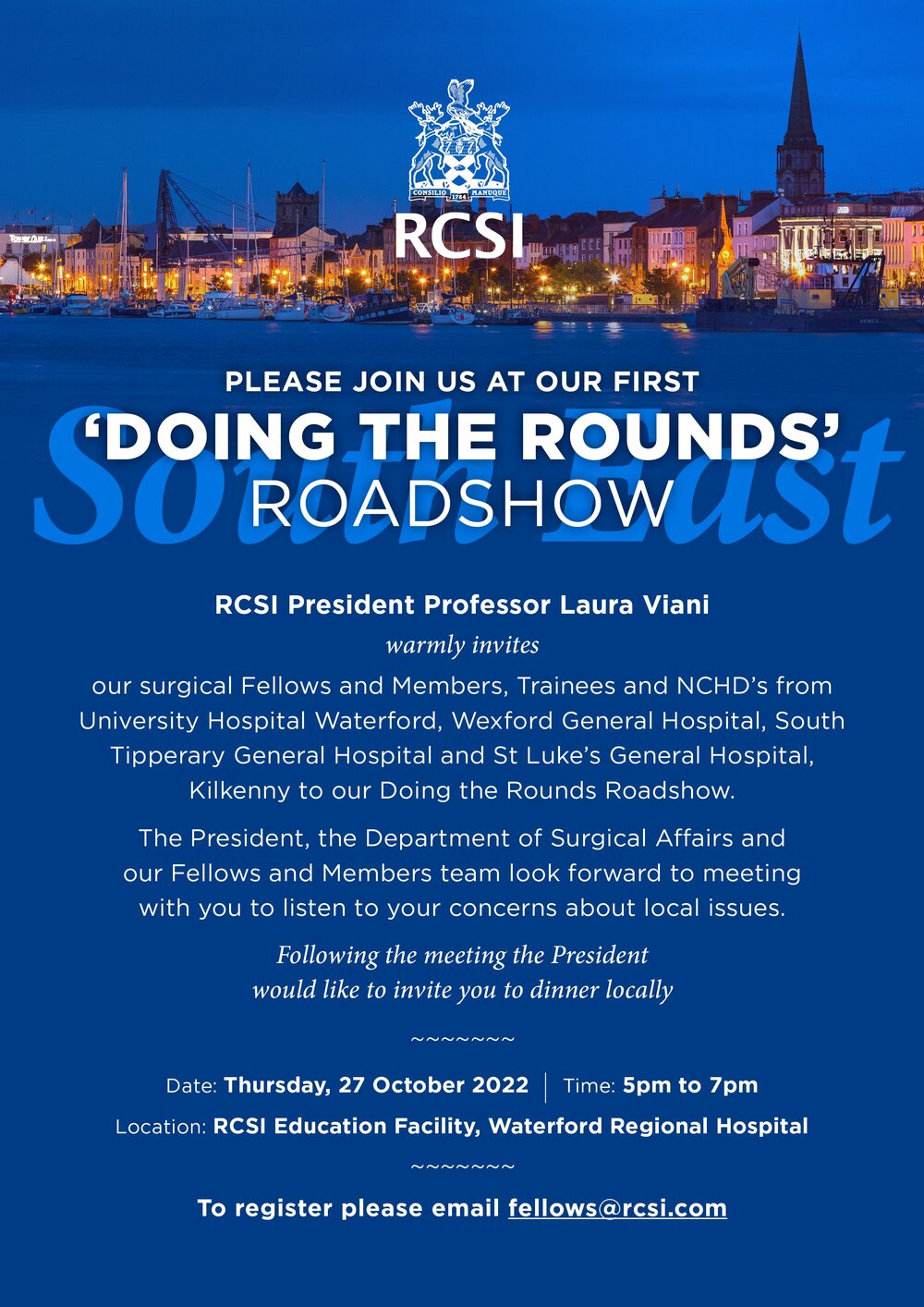 President Viani would like to extend an invitation to our surgical Fellows and Members, Trainees and NCHD's from University Hospital Waterford, Wexford General Hospital, South Tipperary General Hospital and St Luke's General Hospital, Kilkenny to attend so that she can meet with you and listen to your concerns about local issue