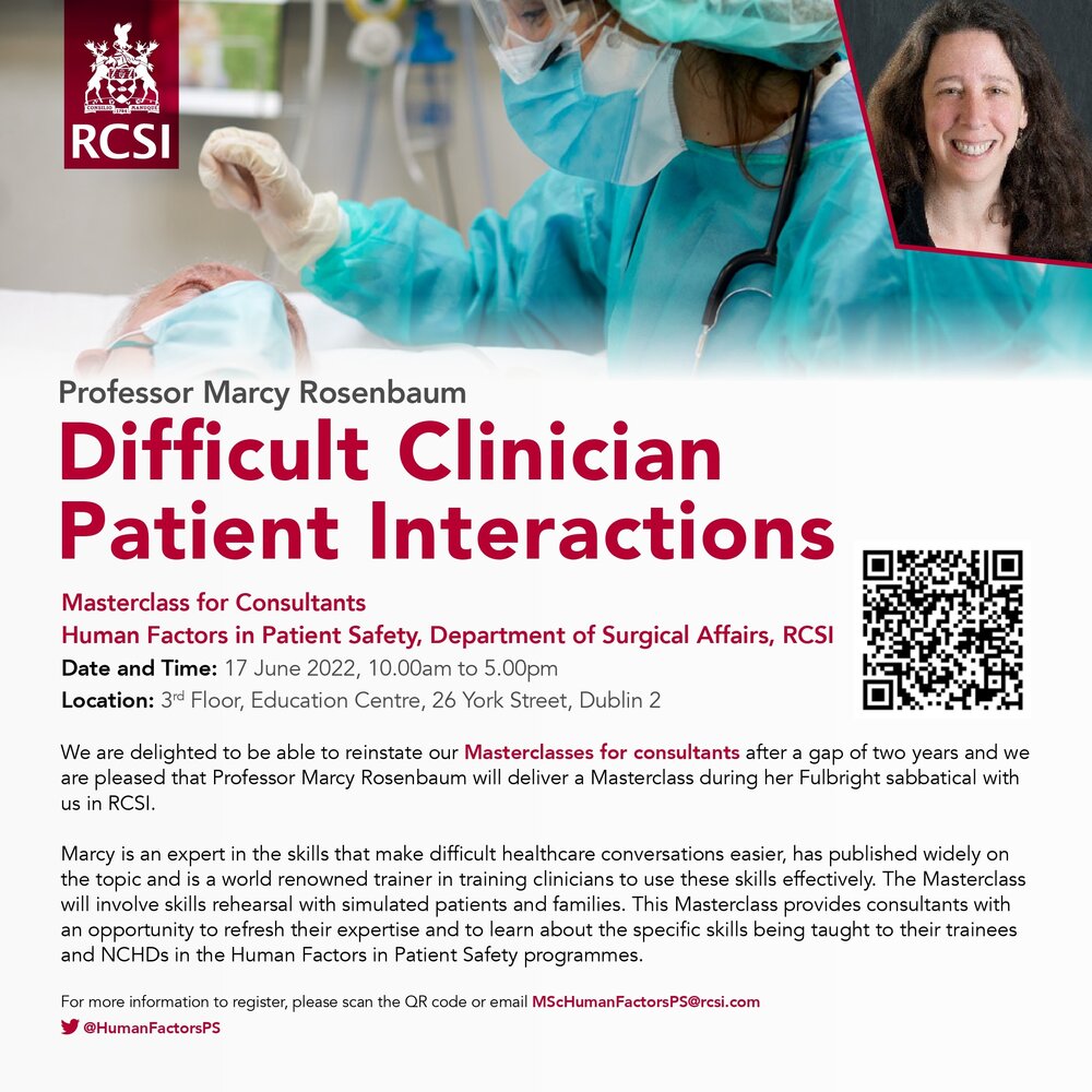 We are delighted to be able to reinstate our Masterclasses for consultants after a gap of two years and we are pleased that Professor Marcy Rosenbaum will deliver a Masterclass during her Fulbright sabbatical with us in RCSI.