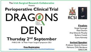 We are delighted to team up with ISRC 2021 Perioperative Clinical Trial Dragons Den on Thursday 2nd September (19:00-21:00) as part of the Sir Peter Freyer Surgical Symposium.