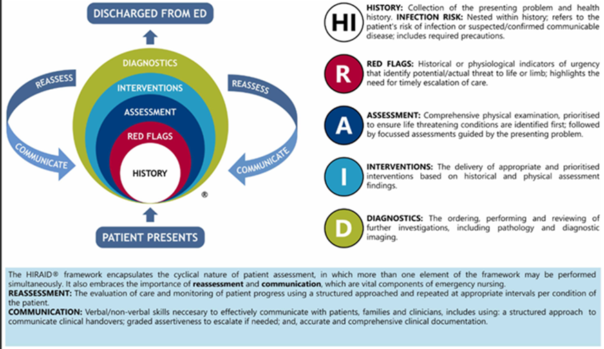 HIRAID: History (including infection risk), Identify Red Flags, Assessment, Interventions, Diagnostics, Reassessment and Communication