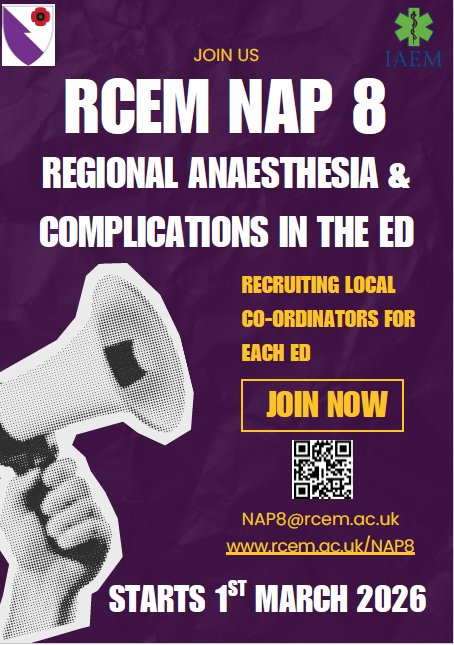 NAP8: Major Complications of Regional Anaesthesia is the first NAP project led by Emergency Medicine, delivered by RCEM, IAEM and RCoA. It will map current ED regional anaesthesia practice and complications to improve care and patient safety across the UK and Ireland. The project is due to go live on 1st March 2026.