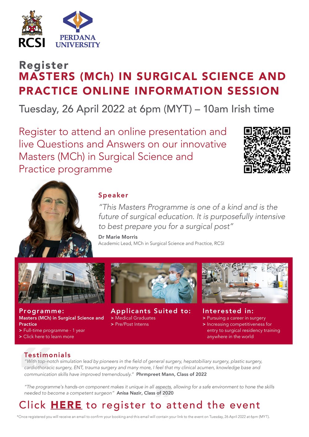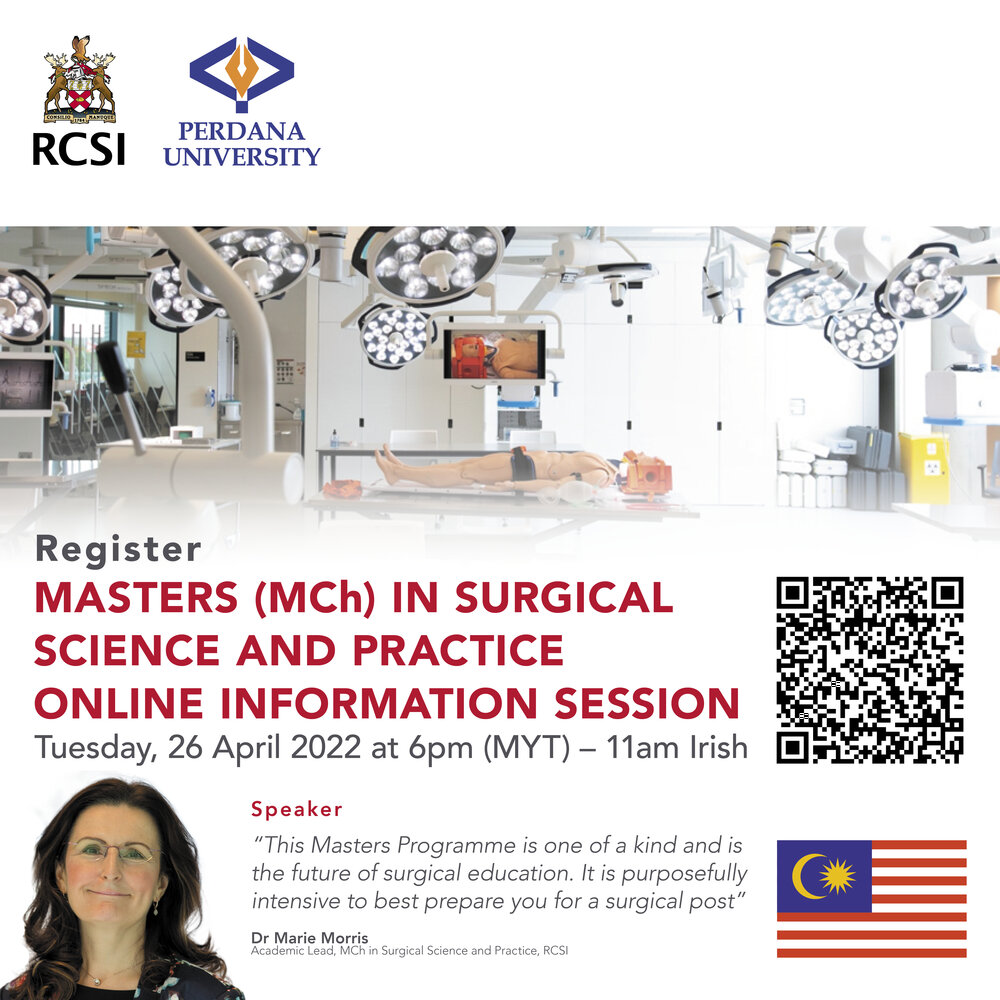 Join us this Tuesday, 26 April 2022 at 6PM (MYT) (11am Irish time) for our MCh in Surgical Science and Practice online presentation with Dr. Marie Morris